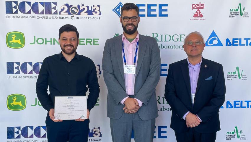 Power and Energy Institute of Kentucky (PEIK) and SPARK Lab researchers received from the IEEE Industry Applications Society Electric Machines Committee (EMC) the Energy Conversion Congress and Exposition (ECCE) Second Prize Paper Award for the article: “Winding Losses in Coreless Axial Flux PM Machines with Wave and Spiral PCB Stator Topologies”, which was presented and published at the 2022 ECCE edition. The main author, Yaser Chulaee, PhD student, is shown on the left in the photo taken after the awards ceremony during this year‘s ECCE edition, together with co-authors Donovin D. Lewis, PhD student, and Dr. Dan M., Ionel, PhD advisor, ECE Professor, L Stanley Pigman Chair in Power, SPARK and PEIK Director. The award-winning paper is based on research on innovative electric machines sponsored by the National Science Foundation (NSF) over a 5-year project that has been recently completed. Co-authors of the conference proceedings article include industry collaborators: Drs. Greg Heins and Dean Patterson, who are with the Regal Rexnord Company that contributed to prototyping and testing. An extended journal version of the paper was published earlier this year in IEEE Transactions on Industry Applications as: "Circulating and Eddy Current Losses in Coreless Axial Flux PM Machine Stators with PCB Windings", and includes as additional co-author Ali Mohammadi, also a PhD student in the SPARK Lab. Since September of last year, researchers from the SPARK Lab within PEIK and the ECE Department in the UK Stanley and Karen Pigman of Engineering have received paper awards at all four major IEEE conferences to which they participated and that included electric machines topics: two consecutive editions of ICRERA, ITEC and ECCE. An exception is represented by IEMDC for which Dr. Ionel served as the Chair of the Conference Steering Committee. The success is reflective of the strong research at UK, which is sponsored by NSF, NASA, DOE and directly by industry. This outstanding success follows the long-standing tradition of research on electric machines and power electronic drives at UK, going back more than half a century ago to the world’s first electronically controlled switched reluctance motor proposed by former UK professor, the late Dr. Syed Nasar. Over many decades, other outstanding contributions by faculty and students included, for example, those jointly made with UK’s frequently visiting professor Dr. Ion Boldea on linear electric machines, vector drive control, and synchronous reluctance motors, among many other topics. IEEE is the world’s largest technical professional organization dedicated to advancing technology for the benefit of humanity. The Industry Applications Society is one of IEEE’s largest organizations with a dedicated focus and a department on industrial power conversion systems, within which the Electric Machines Committee is one of the oldest. With a typical attendance of approximately 2,000 people, ECCE is the largest annual joint technical event of the IEEE Industry Applications and Power Electronics Societies.