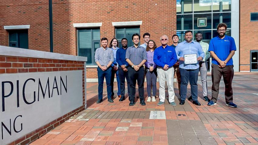 Photo information: The main author of the winning paper, Matin Vatani, Ph.D. student, is shown holding the award certificate in front of the UK Stanley and Karen Pigman College of Engineering. In the front row alongside Vatani are co-authors and Ph.D. students Ali Mohammadi (first from left) and Donovin Lewis (last on right). Dan M. Ionel, faculty advisor to students, is featured in the center of the front row.